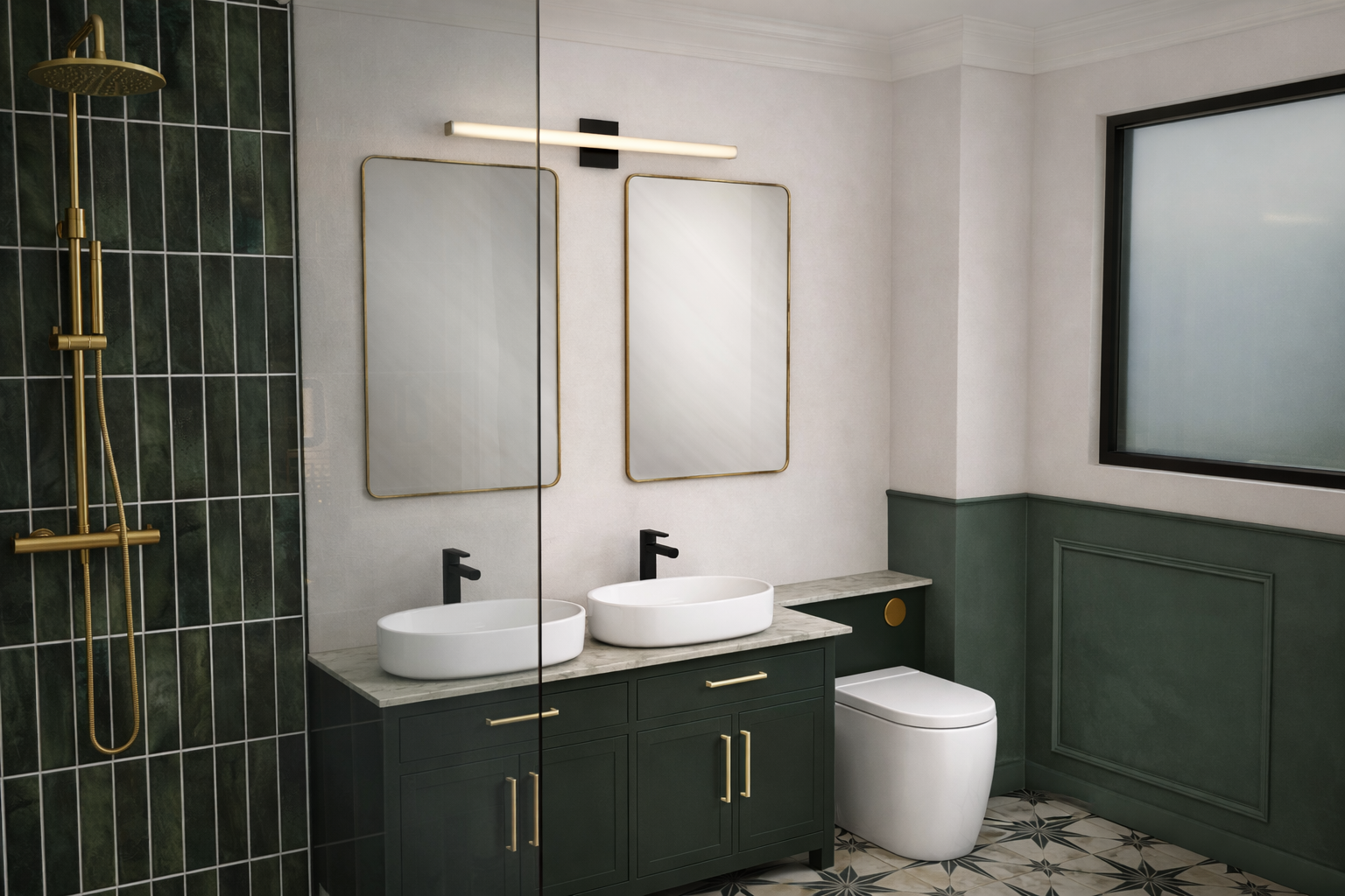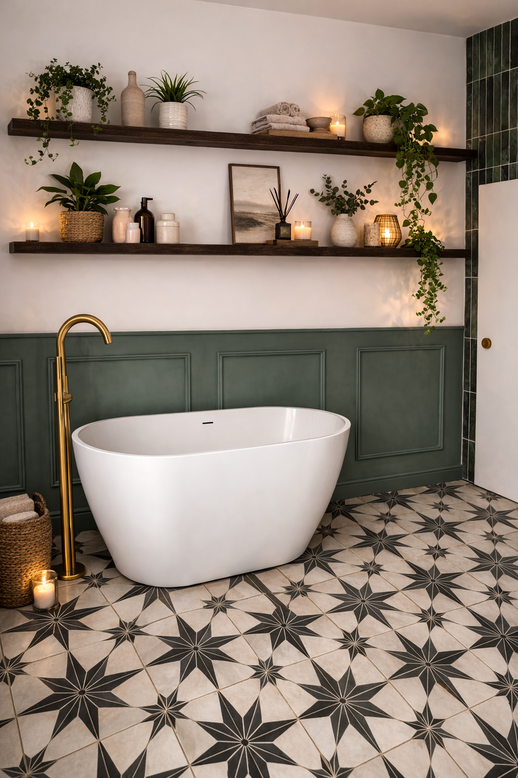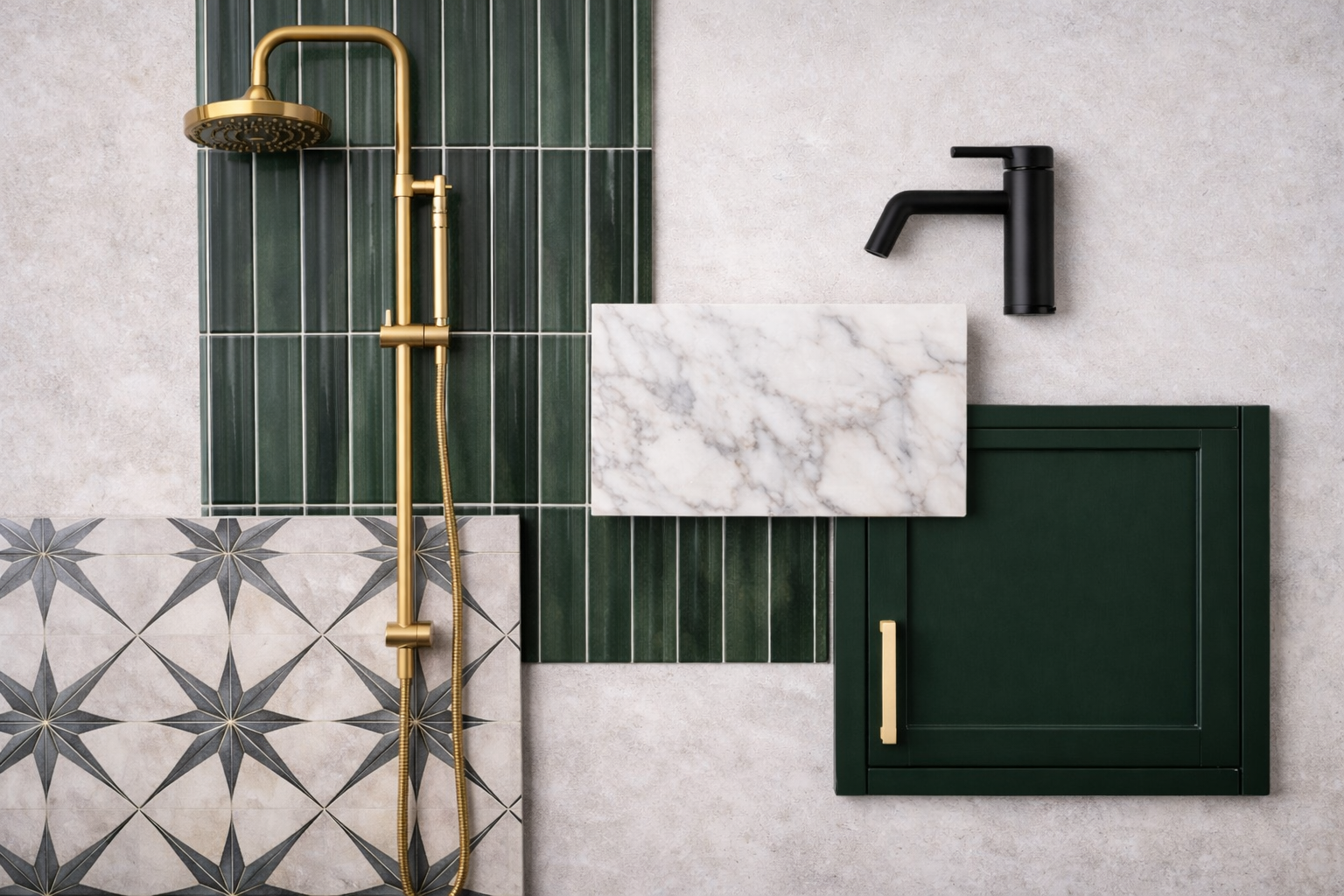 A modern take on classic design, this bathroom blends rich green tones, heritage patterns, and refined brass accents to create a space that feels timeless, warm, and full of character.
